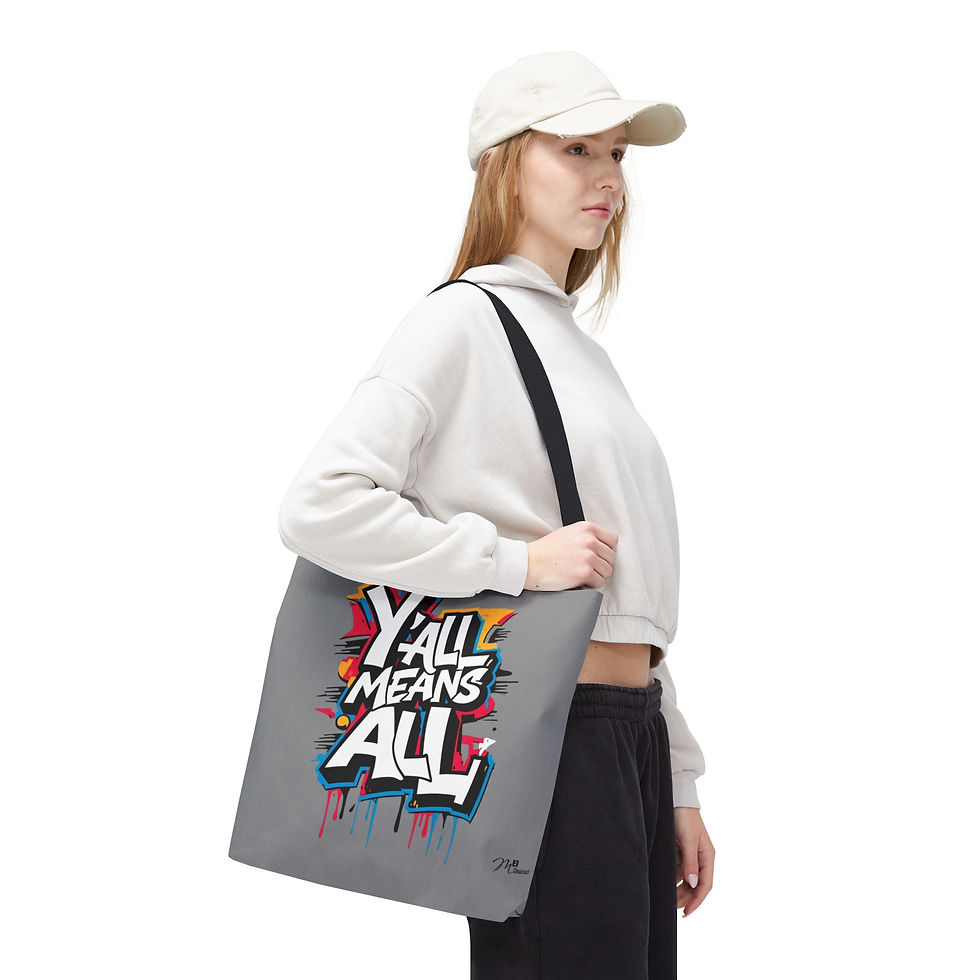 Y’all Means All Tote Bag, Grey, 13x13 16x16 18x18, Equality, Inclusion, LGBTQ+